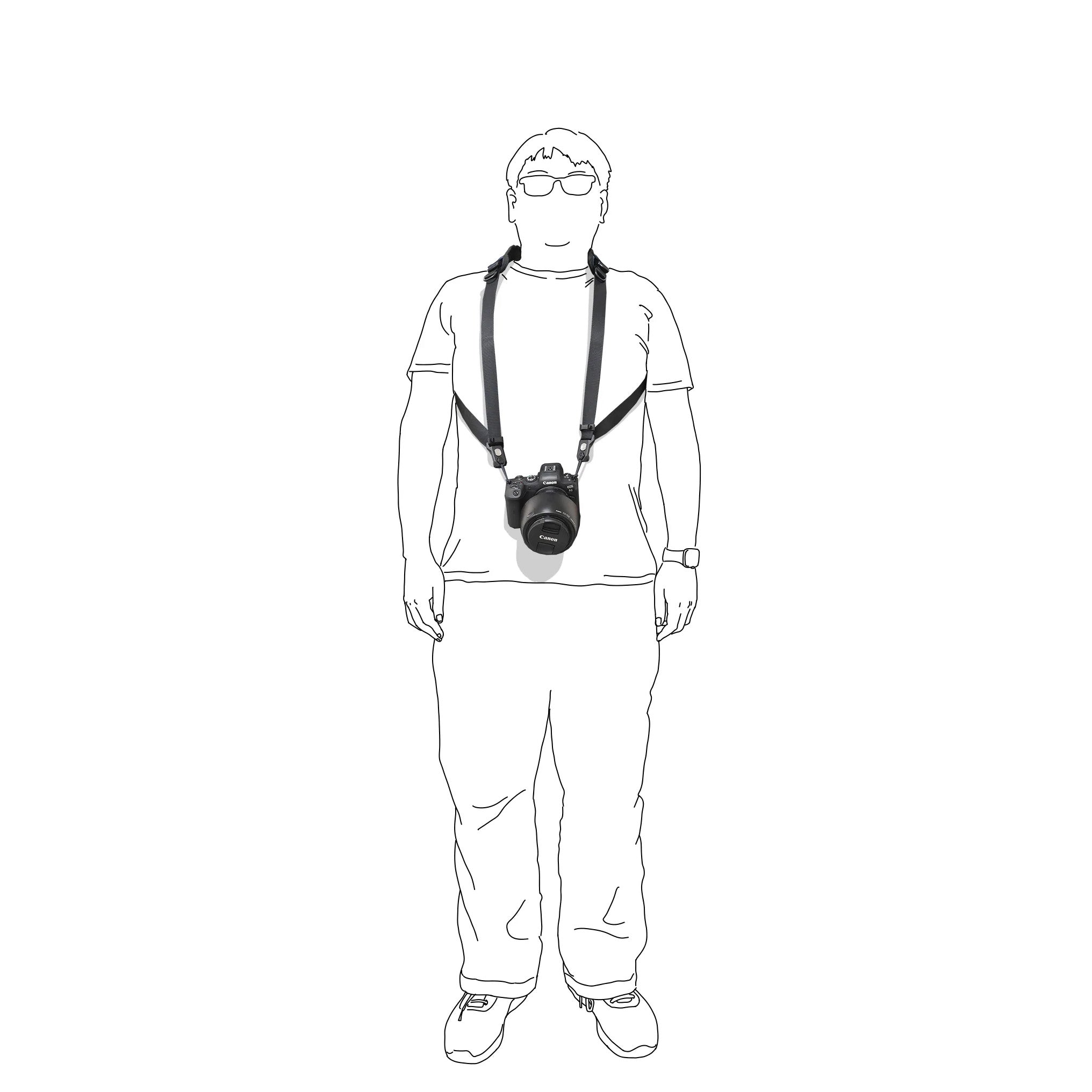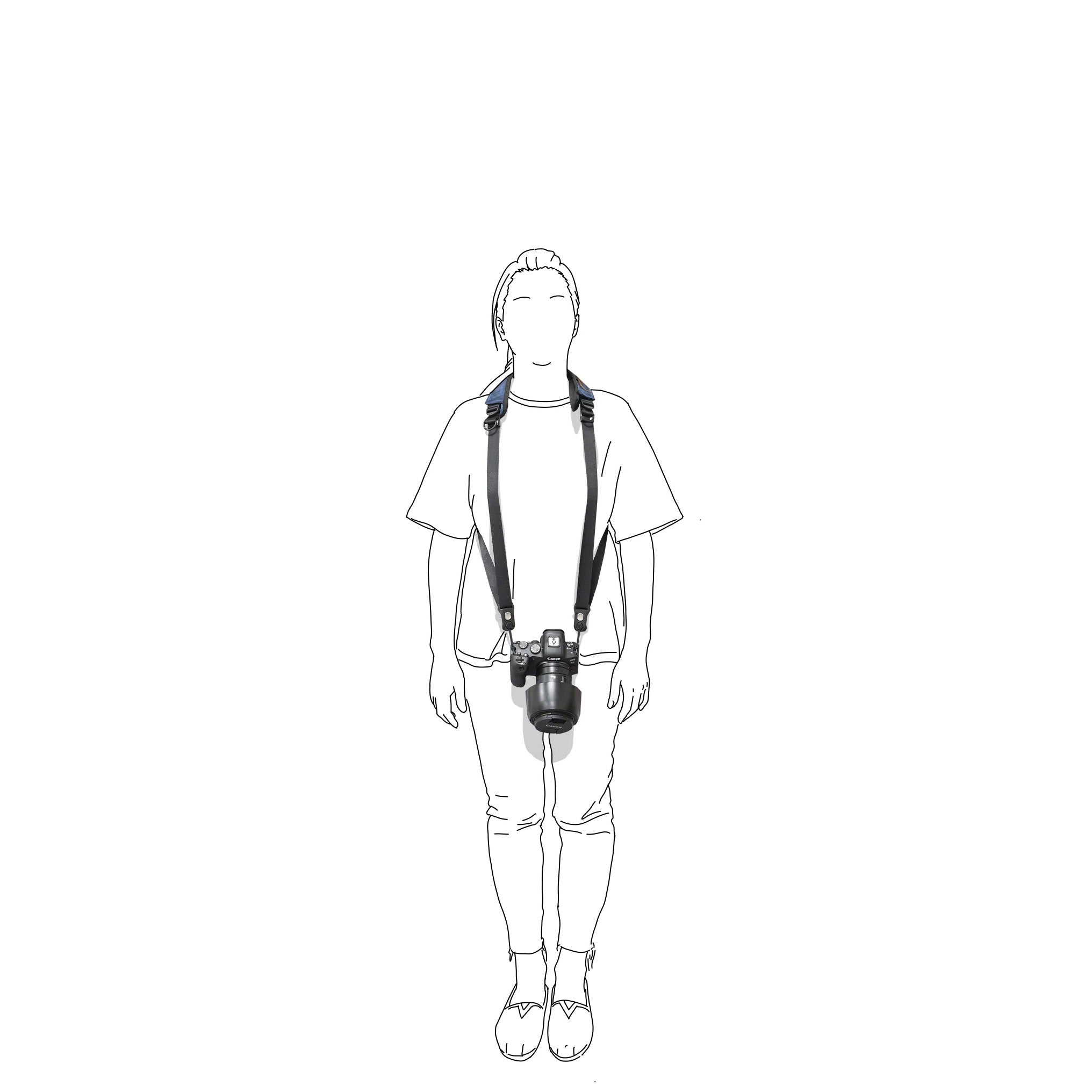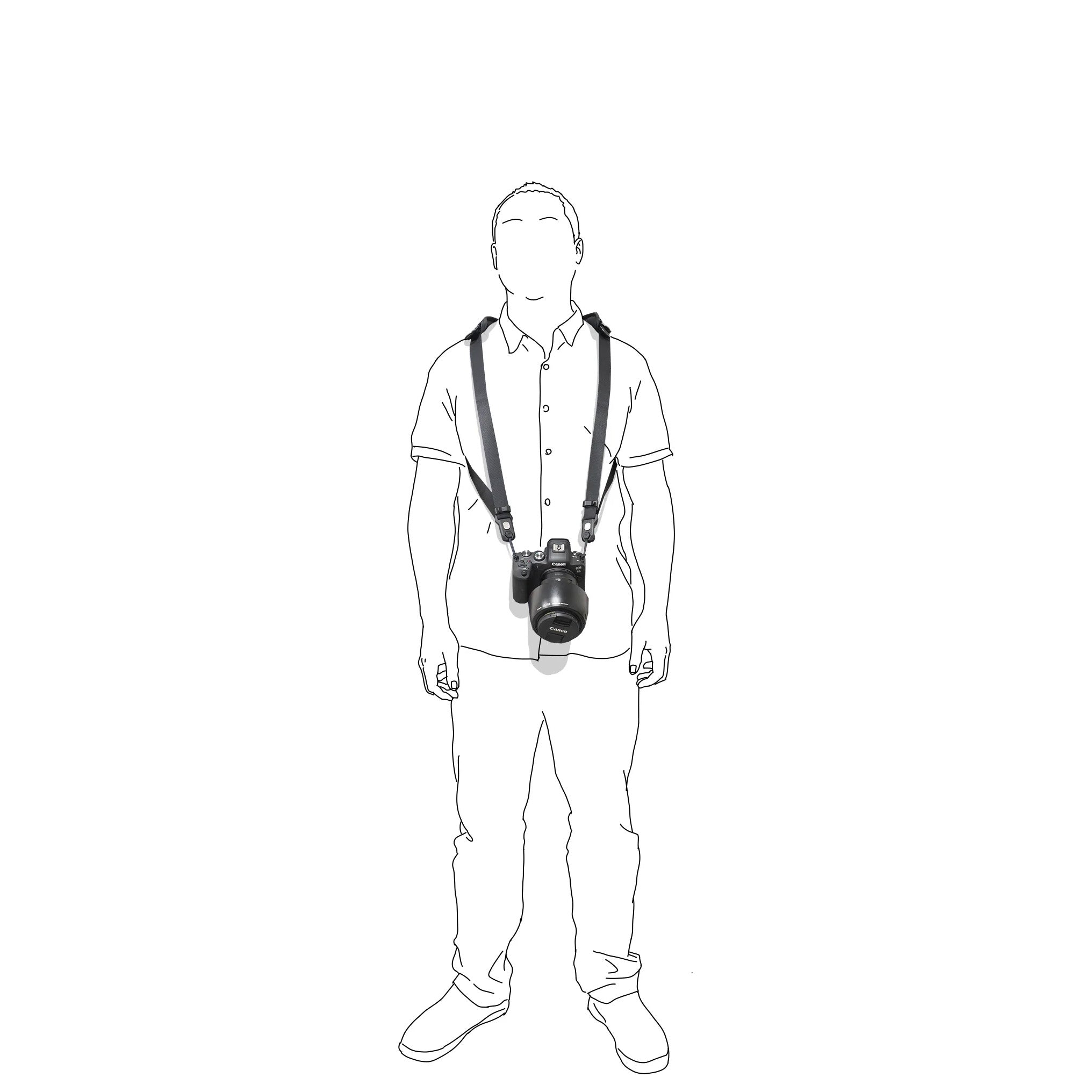 - 背帶尺寸可符合大多數人的體型,下圖顯示背帶拉至最長,在不同身形上的狀態。若將背帶拉緊,則都可以將相機拉至胸前。